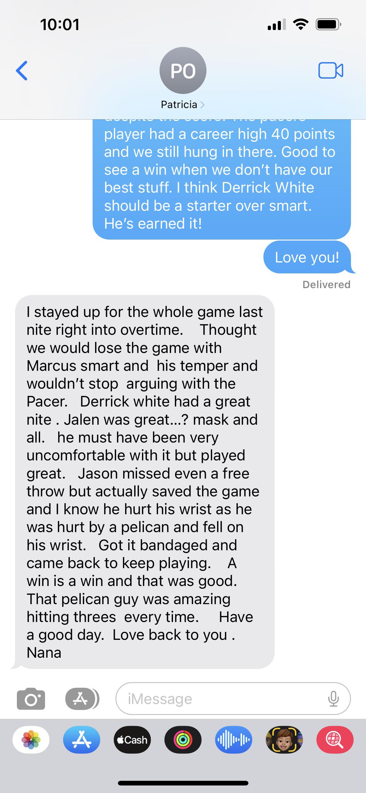 Really love this. My gram died in 2021 and we used to have conversations like this. She was more a fan of the NBA then the Celtics so she had takes on everybody (she watched a whole lot of NBA TV) and this reminded me how cool it was to connect with her in this way. Thank you OP!