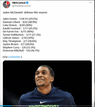 Mr. “Ruin your day”, Jaden McDaniels by wuttang13 Minnesota TimberwolvesNorthwest DivisionWestern Conference Prev Post Ricky Rubio’s on-off splits, corner three-point defense | Cleveland Cavaliers podcast March 6, 2023 Next Post Daily Discussion Thread | March 06, 2023 March 6, 2023 3 Comments mildsar 3 years ago Yesterday when he blocked Sabonis it was so needed. PointGodAsh 3 years ago All defense this man! Remarkable_Night2373 3 years ago People like to call ant our best player. They have no idea how dominant Jaden has been on the defensive side. Write A CommentYou must be logged in to post a comment.