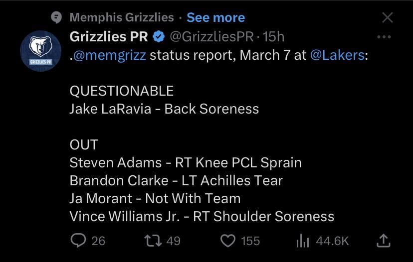Grizzlies have done without Ja Morant- 20-5 without Ja in 2021-22. They have a very deep roster. What I really wished is Dillon is out. That guy really annoys the hell out of me.