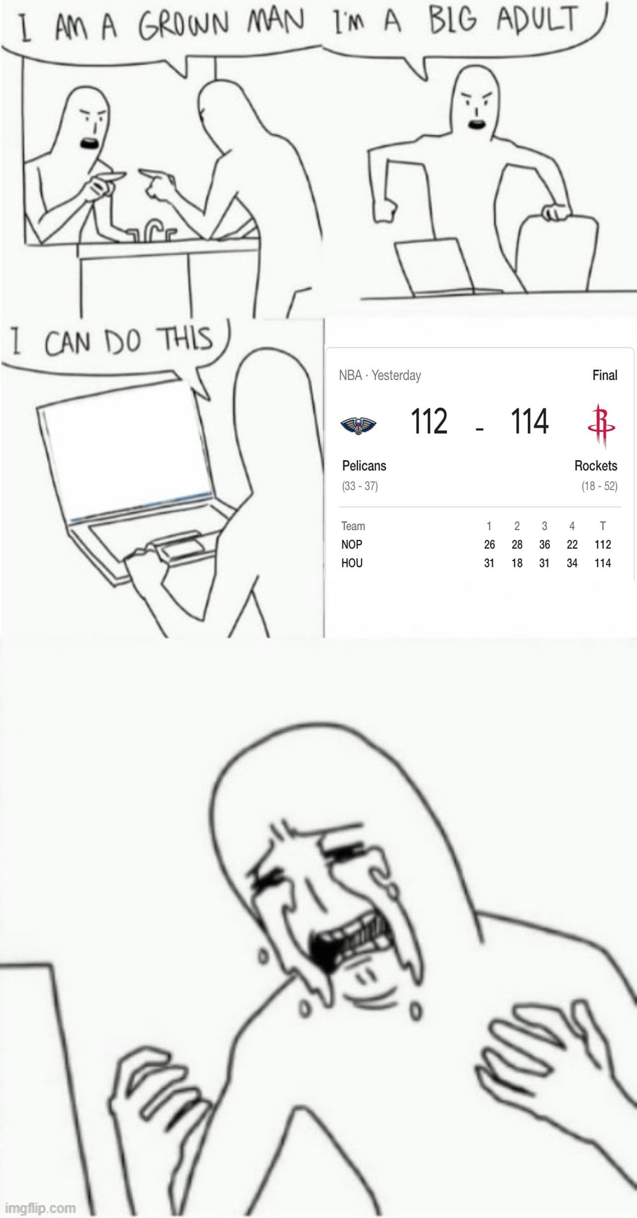 Man I did the same exact thing. Checked the score right when it said 0:00 instead of final. I was like you gotta be kidding me. Last time I checked, they were winning. I started watching another one piece episode and came back to see that. 😂💀