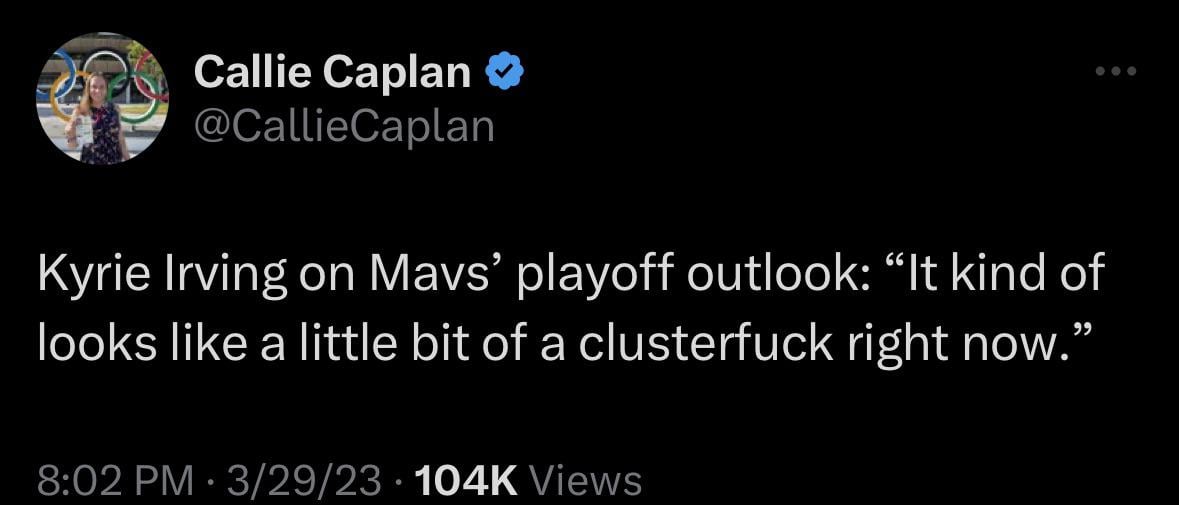Just posting to say 🗣️FTM! by ST012Mi Houston RocketsSouthwest DivisionWestern Conference Prev Post FINALLY AFTER 10,000 YEARS, ROCO HAS BEEN FREED!!! March 30, 2023 Next Post Lakers vs Bulls | Lakers Highlights March 30, 2023 4 Comments ST012Mi 3 years ago [tweet](https://twitter.com/calliecaplan/status/1641274783718334466?s=46&t=IVwCnWBGBmlVtsz55wyv1w) Few_Mulberry5372 3 years ago Luka won’t be on there in 2 years Mavs lucked into a generational talent and have done their best to completely fumble it and waste the early part of his career. Absolutely shameful Electrical-Clock8251 3 years ago  Mark Cuban when trading for Kyrie went exactly the way it did every other time bkuuretsu 3 years ago Rockets legend kyrie Write A CommentYou must be logged in to post a comment.