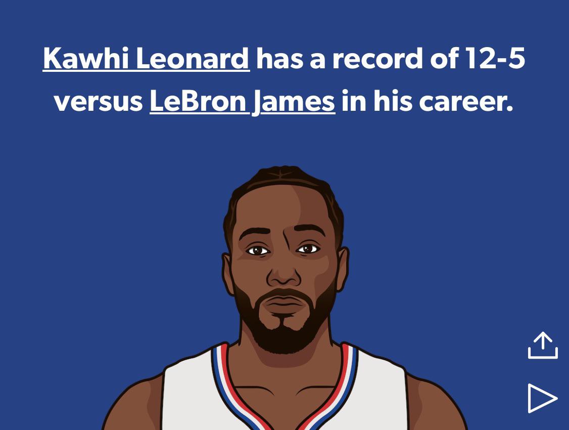 “Kawhi has a 12-5 career record vs Lebron. In those games, Kawhi is a +65, Lebron is a -22”