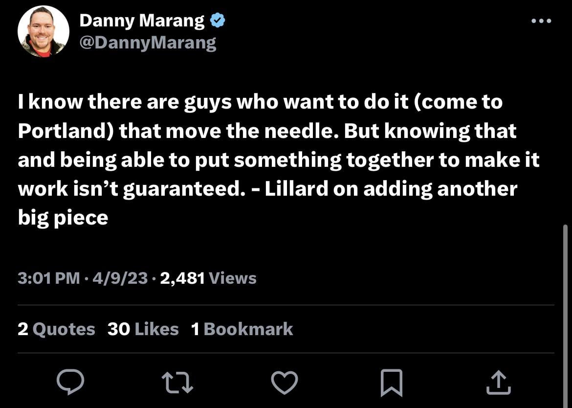 Fans getting stoked on mentions of needle movers need to remember that Dame’s contract makes a lot of these prospective guys very, very difficult to attain. Ant and Nurk might get close financially with some of these names being mentioned, but talent wise, nearly every single team we engage in a conversation is going to INSIST on Sharpe’s inclusion. He’s the prize due to his on court value and team friendly deal.