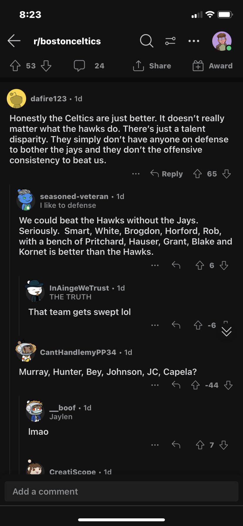 I hate Boston sports so much. Part of it is me being a hater, I admit, but also because their fans are so terrible to be so spoiled. Iām a fan of a lot of the players but I hate the Celtics as a complete entity. Hawks in 4.