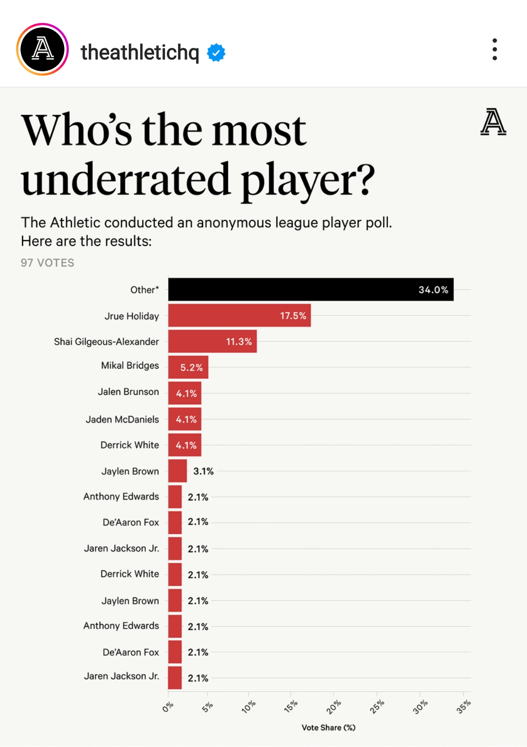 (Context: The Athletic conducted an anonymous league player poll and someone messed up data processing)