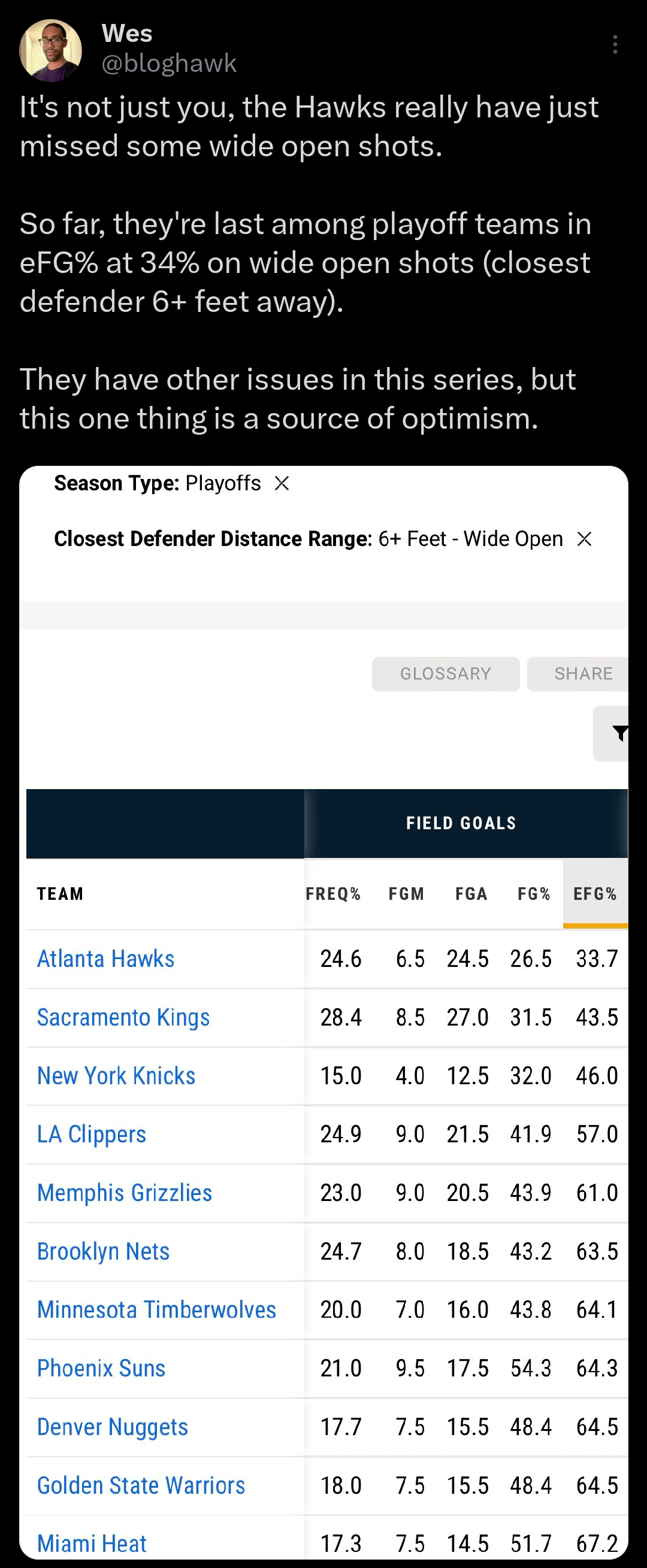 Interesting fact from Wes (@bloghawk) – the Hawks have the worst eFG% in the playoffs on wide open shots, almost 10% lower than the second worst. Being able to hit those alone would make a huge difference in this series.