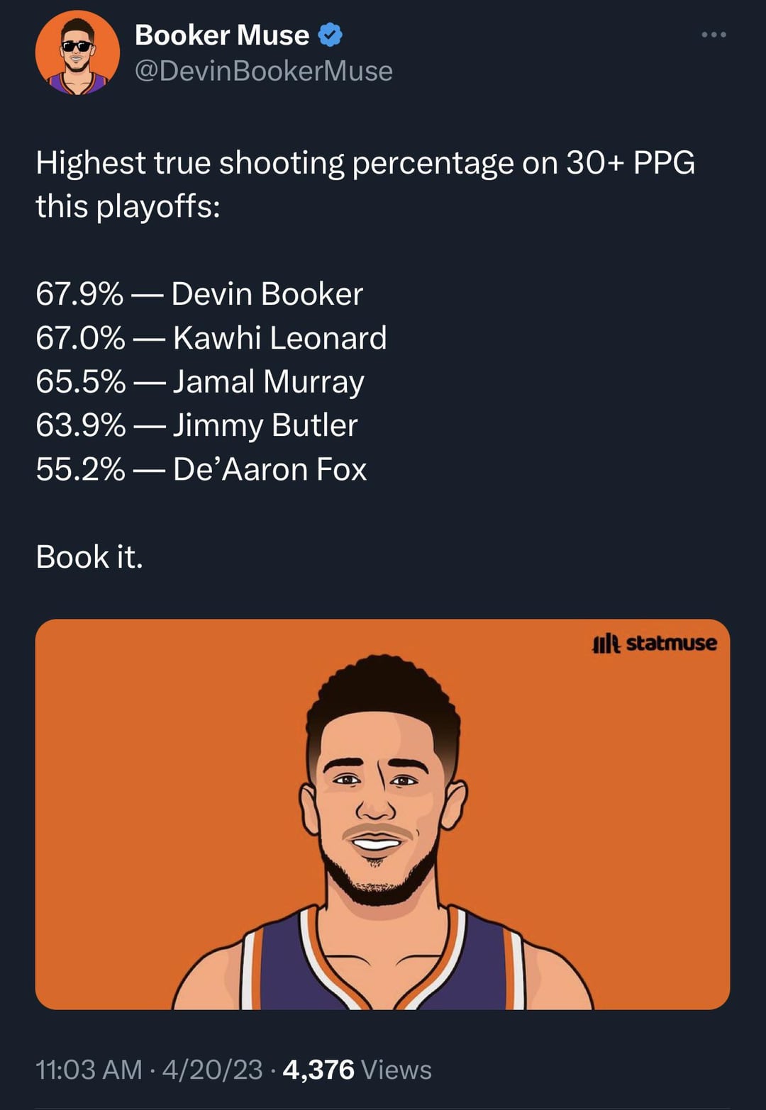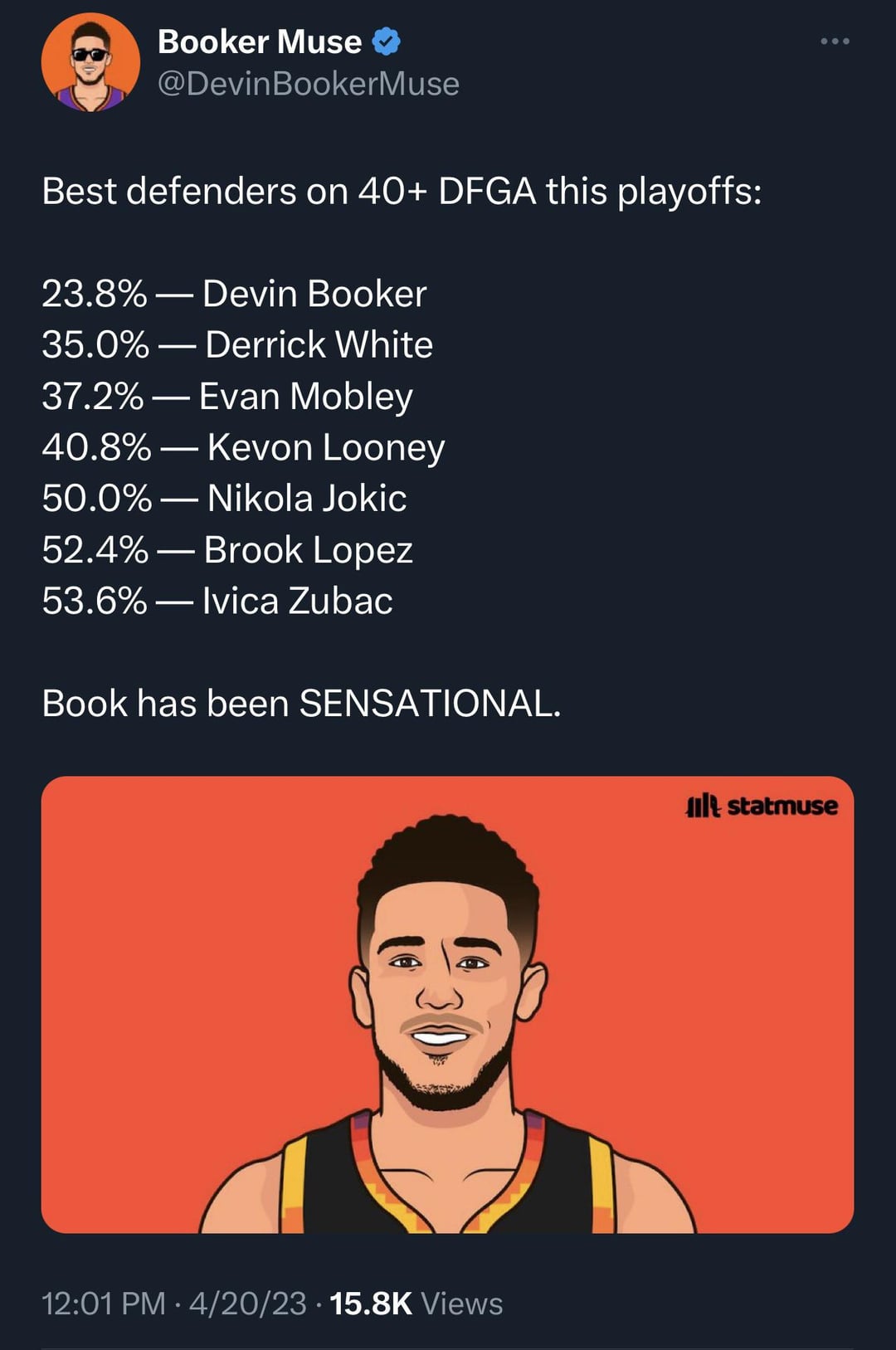 Booker has arguably been the best 2-way player thus far in the first round of the 2023 NBA Playoffs. by prematurely_bald Pacific DivisionPhoenix SunsWestern Conference Prev Post Lakers fans when players try against them in a playoff game April 20, 2023 Next Post What are the #Pistons up to this offseason?! April 20, 2023 9 Comments inksta12 3 years ago Give me this all playoffs. Dude seems to be on a mission. Qlix0804 3 years ago That defensive stat is actually bonkers for a guard swsundevil 3 years ago The 30ppg is a very high threshold. runaway86s 3 years ago in 2 games of guarding who? russ? Shoddy_Ad7511 3 years ago Minimum 30 per game ππππ Schwalm 3 years ago Delete this shit. Itβs been 2 games. Plus the thresholds are wack OriginalBus9674 3 years ago Saw a NBA thread last night where people still Insist Murray and Donovan are better. MusukoRising 3 years ago The crazy thing is he could still be even better in a couple of areas. Dude works his ass off and itβs showing. tisdue 3 years ago Because he’s the fucking MAN, dude. Write A CommentYou must be logged in to post a comment.