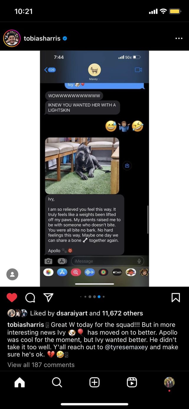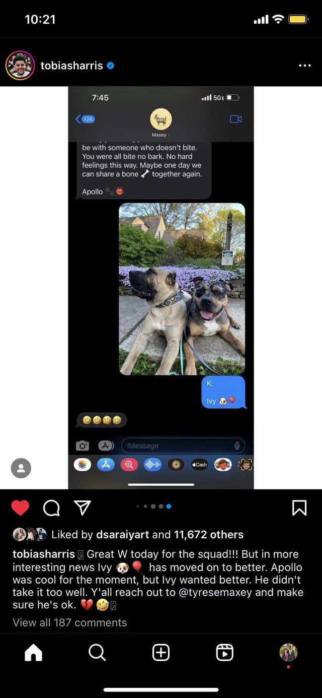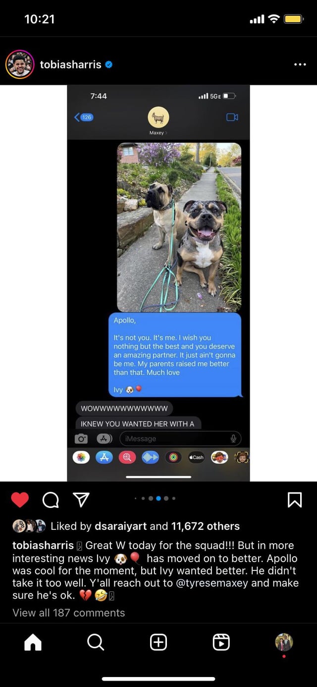 PSA: Tobi’s and Maxey’s dogs who were previously in a relationship have now broken up by Alex_Phillips_ Atlantic DivisionEastern ConferencePhiladelphia 76ers Prev Post 2023 NBA Playoffs: Heat blow out Bucks in Game 3, take 2-1 series lead I CBS Sports April 23, 2023 Next Post NBA Gametime “IMPRESSED” Jimmy Butler scored 30 Pts help Miami Heat take 2-1 series lead over Bucks🔥 April 23, 2023 9 Comments mimepants 3 years ago Lmao what?? Hahaha my parents raised me better than that, and not the light skin 😂 this is hilarious. shifty4388 3 years ago Teammate vibes loco1989 3 years ago Yoo, what the hell did I just read 🤣 🤣 Johnga20 3 years ago Harris is so important to our vibes. Supergreat teamate. AddisonsContracture 3 years ago Love the goat picture for Maxey’s contact photo izimbra5150 3 years ago Hahaha such dorks, love these guys xatnnylf 3 years ago bro these dudes straight clowns lmao, love it tho No-Awareness6823 3 years ago 😔 miserly_booty 3 years ago this shit is funny afWrite A CommentYou must be logged in to post a comment.