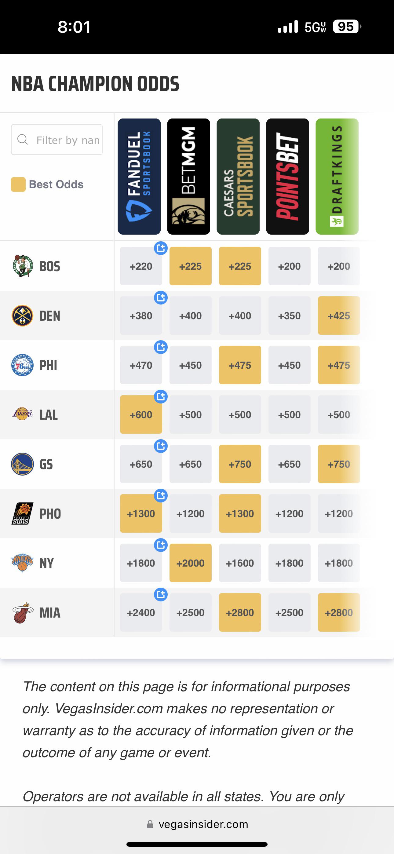The people who vote with their wallet think more highly of the nuggets than most pundits by SheepherderFormer343 Denver NuggetsNorthwest DivisionWestern Conference Prev Post Raptors FAVOURITES to SIGN Dillon Brooks – Exciting Team Canada Update | Toronto Raptors News May 4, 2023 Next Post Are the Phoenix Suns already cooked in their series vs. Denver Nuggets? | Brother From Another May 4, 2023 6 Comments SheepherderFormer343 3 years ago Current odds to win the championship Backwardsbackflip 3 years ago Got nuggets at +1600 cant wait to be rich. HardLiquorSoftDrinks 3 years ago I put $125 on it back in Feb when they were +1100. murrayforthree 3 years ago Gambling is haram. Astagfirullah brothers. Kentavius Caldwell Sheik will not be happy about this. ctrlaltskeet 3 years ago I got in at +2100 before the season and +1300 New Year’s day after that Celtics game. I learned if you win over 5k in CO, you have to report it. Radioactive__Lego 3 years ago https://preview.redd.it/ejetb77nwsxa1.jpeg?width=200&format=pjpg&auto=webp&v=enabled&s=3340714c3aadcd6628dad18736f92a6ad68d17ac I put $20 on Miami at New years at +4400 as a “haha, wouldn’t that be crazy?!” Then they beat the Bucks, and Denver is sailing towards the finals. Now I’m torn between basic greed and lifelong hopes. Write A CommentYou must be logged in to post a comment.
