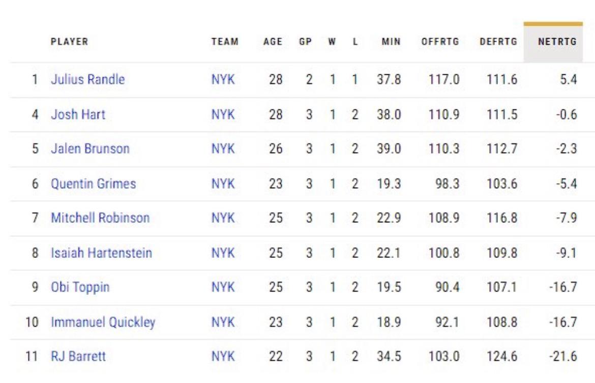 Julius Randle is the only Knick with a positive net rating has the highest offensive rating between the team and has a better defensive rating compared to Mitch Brunson and RJ and is tied with Josh hart