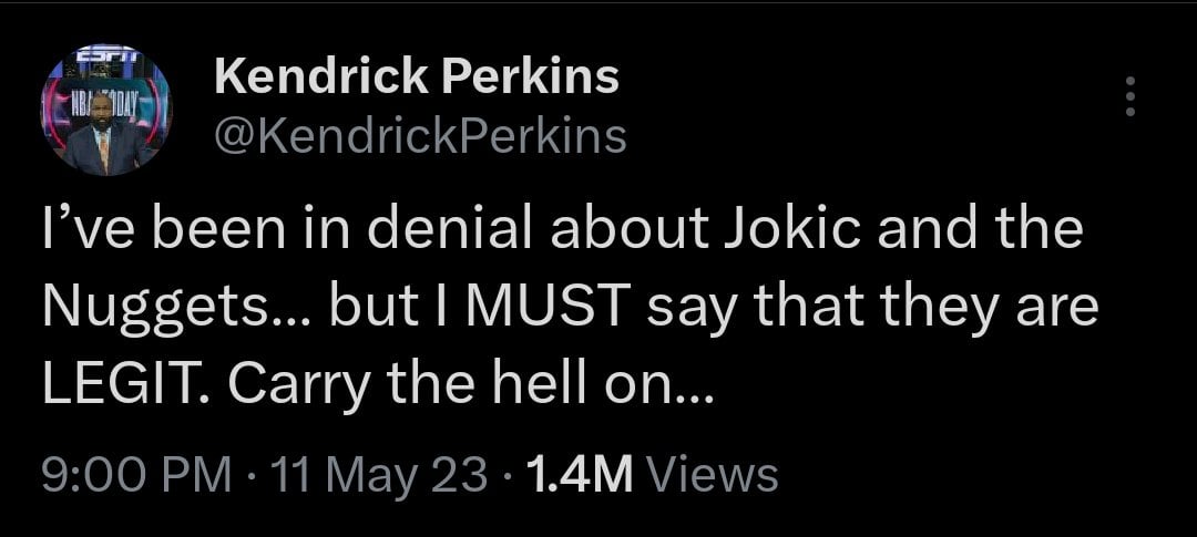 Nuggets stomp their way to the WCF, first team to make it, watching games tonight with a big-ass bowl of popcorn. And Kendrick Perkins, who is paid to speak about professional basketball, finally concedes that the team is “legit.”