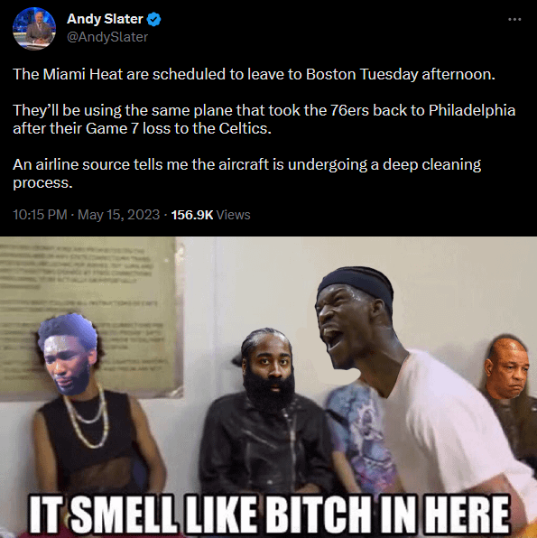 Get that stench of loser out of our team’s plane, please. by HunkMuffinJr Eastern ConferenceMiami HeatSoutheast Division Prev Post 1995 NBA World Champions Houston rocket’s May 16, 2023 Next Post NBA Draft Lottery Day! The Orlando Magic are hoping for some good luck, but it is not essential May 16, 2023 8 Comments AgoraRises 3 years ago For a second I thought the pic below was included in the Andy Slater tweet 💀 Relevant-Struggle394 3 years ago I laughed out loud PrincetonMaxwel 3 years ago I thought teams had their own planes with team logos on it. Kitchen-Wheel63 3 years ago Wheres the inset picture of TJFucker?😂 MusterBait 3 years ago Embiid might as well sign a Vetmin contract with us on the way out. XanderAndretti 3 years ago This is basically what Jimmy did at the wolves practice lmfao. Alpha_King007 3 years ago Harden shit his pants again, but this time on the plane smh https://preview.redd.it/s5o93h7hl80b1.jpeg?width=828&format=pjpg&auto=webp&v=enabled&s=5ecc14d58d0f3c8abfefdaa873ad608f92c29eef plebeiantelevision 3 years ago This is the only Process that matters Write A CommentYou must be logged in to post a comment.
