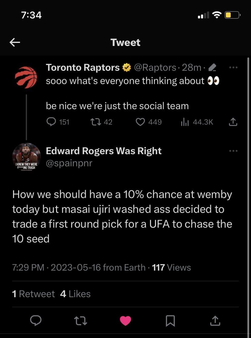 This team has been directionless for 4 seasons now. The Thad trade, Jak trade, and project power forward were unmitigated disasters. I’m just going to go ahead and say it, Masai is washed. I’m grateful for the championship and some great years of basketball to watch but he’s been fucking up these past few years.