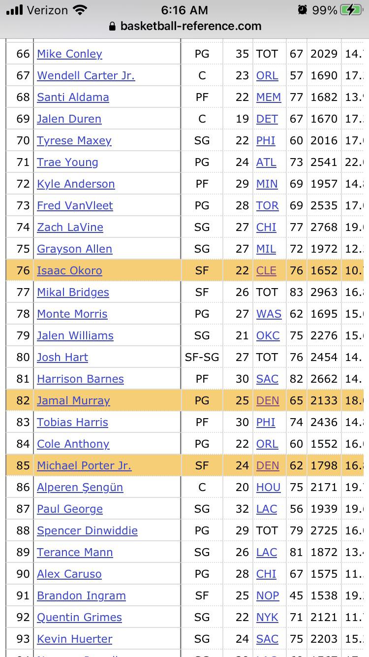 Murray and MPJ are shooting lights out at high volume. Not sure why their win shares aren’t higher