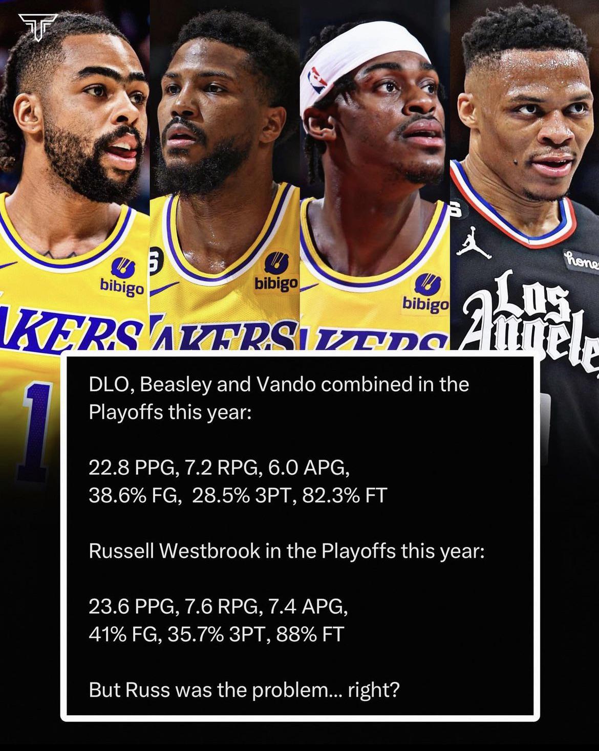 Playoff statistics are irrelevant. The Lakers likely don’t even make it to the playoffs with Russ. They were so close to elimination before the trade it’s insane.