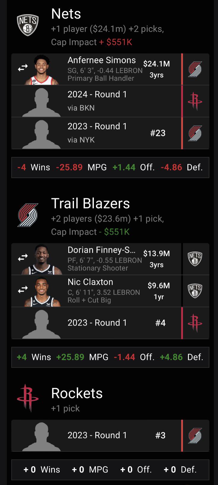 I really like this trade actually. Great idea to give BKN their pick back from Houston, balancing out the roster by bringing in a 3D wing + a great center of the future + keeping a top 5 pick. You could still make a Nurk+Nas+23 trade to bring in more shooting to offset the loss of Simons, maybe send Nurk to Dallas for THJ to be another shooter, or even target Buddy from Indiana.