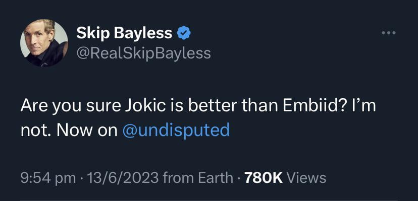 Tweets like this are when you can really tell Skip is a master of his craft. If you agree with something he says, even if it’s a little ridiculous, you laugh a bit and move on with your day. If you disagree, you become filled with deep irrational hatred of this man and the fact that he still has a job in sports media. And he always plays both sides, so you’ll never 100% love him, and you’ll never 100% hate him; there’s always one take that swings you a little the other way. Don’t get me wrong, he’s everything wrong with sports media. But he’s so damn good at it.