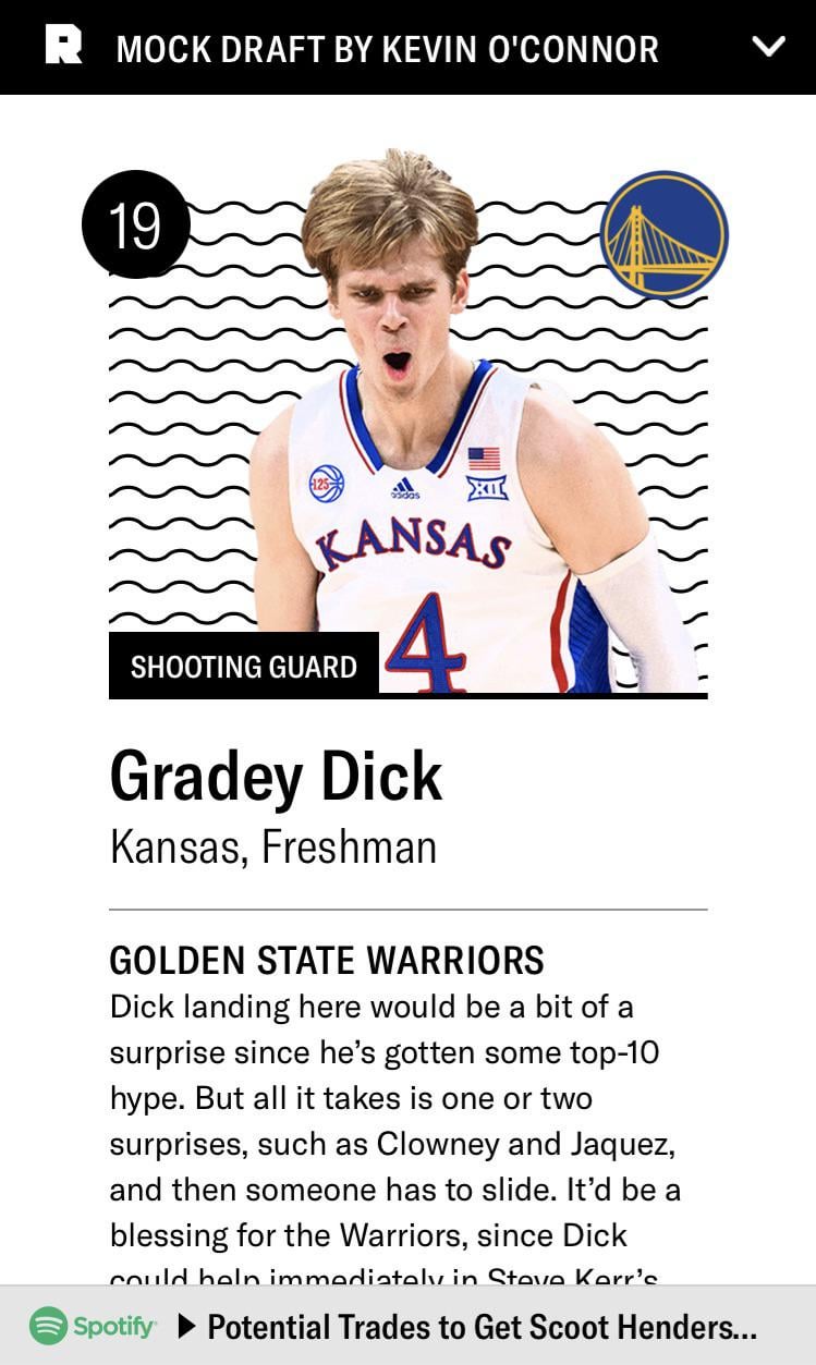 Huge Warriors fan and huge Jayhawks fan here. So I’ve seen a lot of Grady Dick. These are my personal observations from watching every Jayhawks game this year.