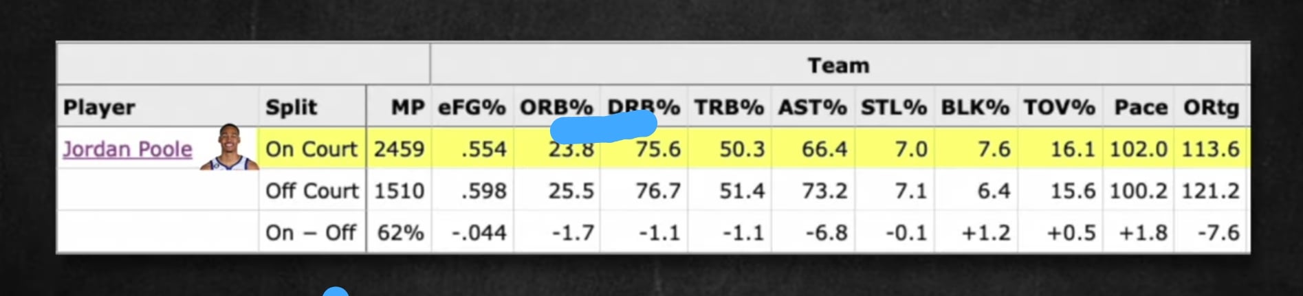 Warriors were a better offensive team with Poole off the floor and Poole played all 82 games this season so this isn’t some selective statistics.