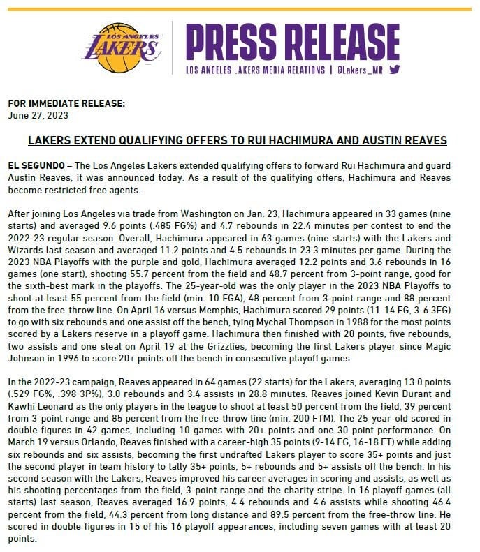 [Buha] The Lakers announced they have officially extended qualifying offers to Rui Hachimura and Austin Reaves, making both players restricted free agents.