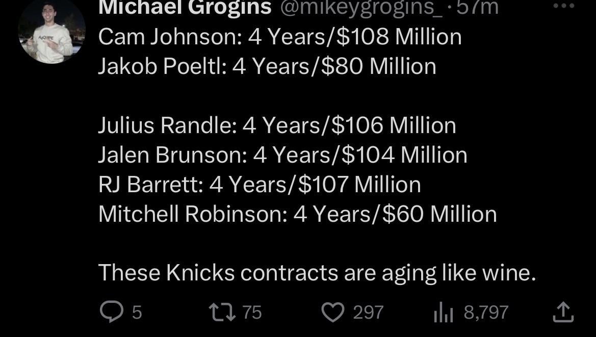 Yes, we’re still missing that #1 and RJ needs to be more consistent…but you’re not gonna tell me that Randle isn’t worth that $115 million or that RJ isn’t worth that $110 million…and we all know Brunson is now a $180 million contract that is only getting paid $110 at max.