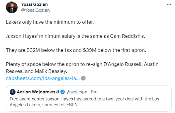 Per Yossi Gozlan, Jaxson Hayes’ minimum salary is the same as Cam Reddish’s. The Lakers still have plenty of space below the apron to re-sign D’Angelo Russell, Austin Reaves, and Malik Beasley.