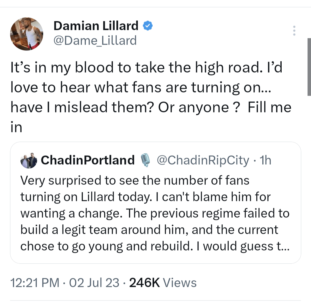 He’s doing the thing where people single out the extreme reaction and then react to it, which is a way to garner sympathy. It happens all the time on Twitter. Pretty evident that most unhappy fans are unhappy due to the specific trade demand to a team with bad assets, but he singles out the Dame-hater minority to respond to instead.