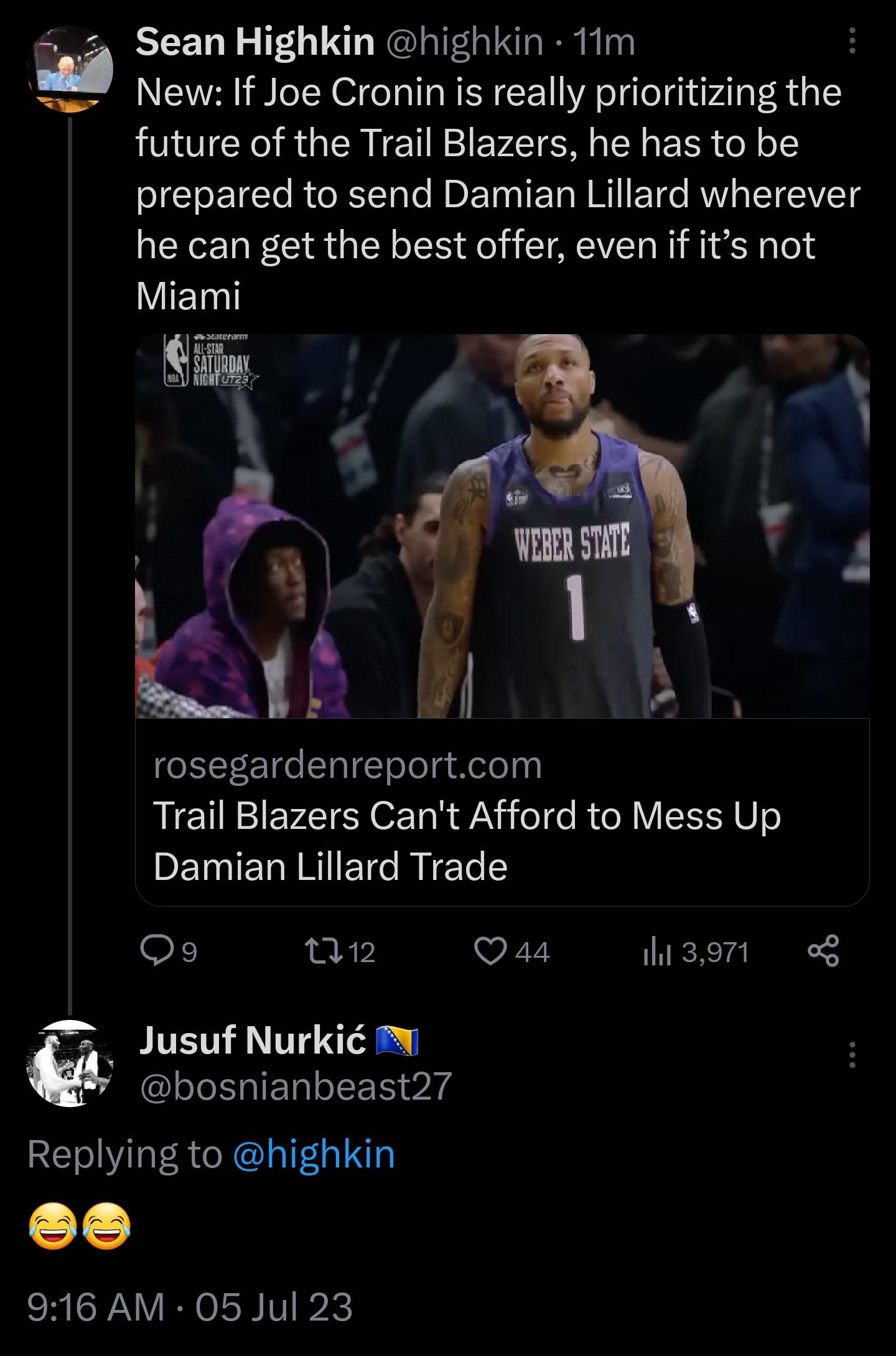 Itās starting to seem like Miami and Dame just thought heād request and Portland would just say ok ājust give me what you canā ⦠honestly I still wish he stayed but thatās done I know. It really seems like there are three way simpler options to get what they want in NY, San An, or Utah. Wonāt happen but it would probably end this whole crap