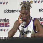 Colby Jones speaks to the media following a win over the Miami Heat in the California Classic on July 5, 2023.