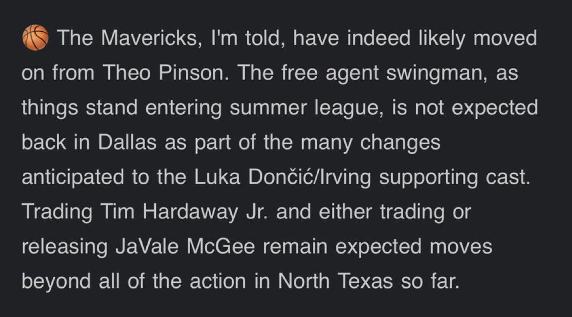 [Marc Stein] In Marc Stein’s latest column, he reports that the Mavs have likely moved on from Theo Pinson and trading Tim Hardaway Jr. And either trading or waiving JaVale McGee remain “expected moves” for the Mavs.
