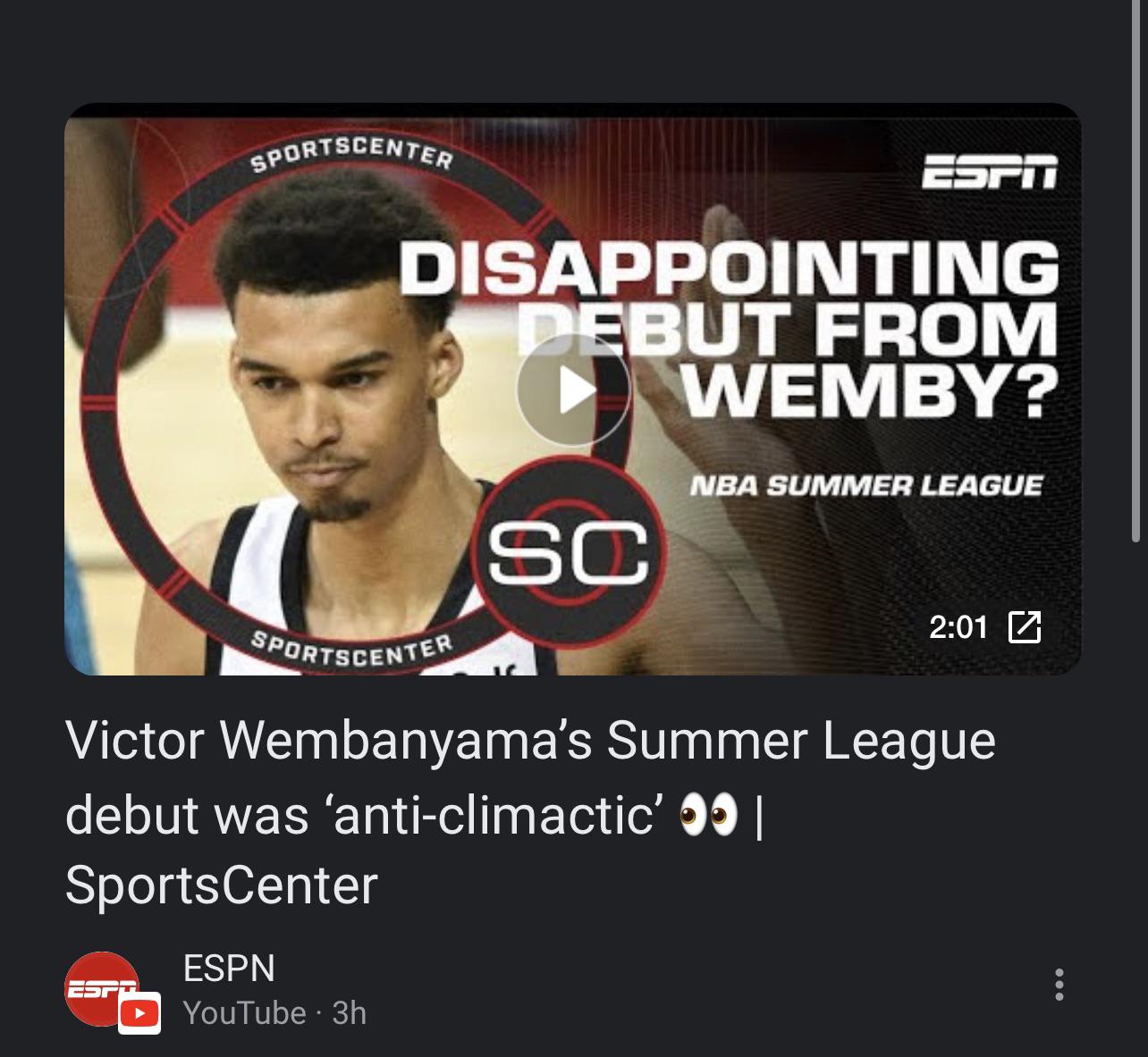 Man, this is going to get so tiring over the next few years. Every performance of his is going to get absolutely scrutinized by the media. I really hope the boys in the Org are helping Wemby keep his head on straight with all the bullshit noise out there God knows I’d have a hard time not letting it get to me.