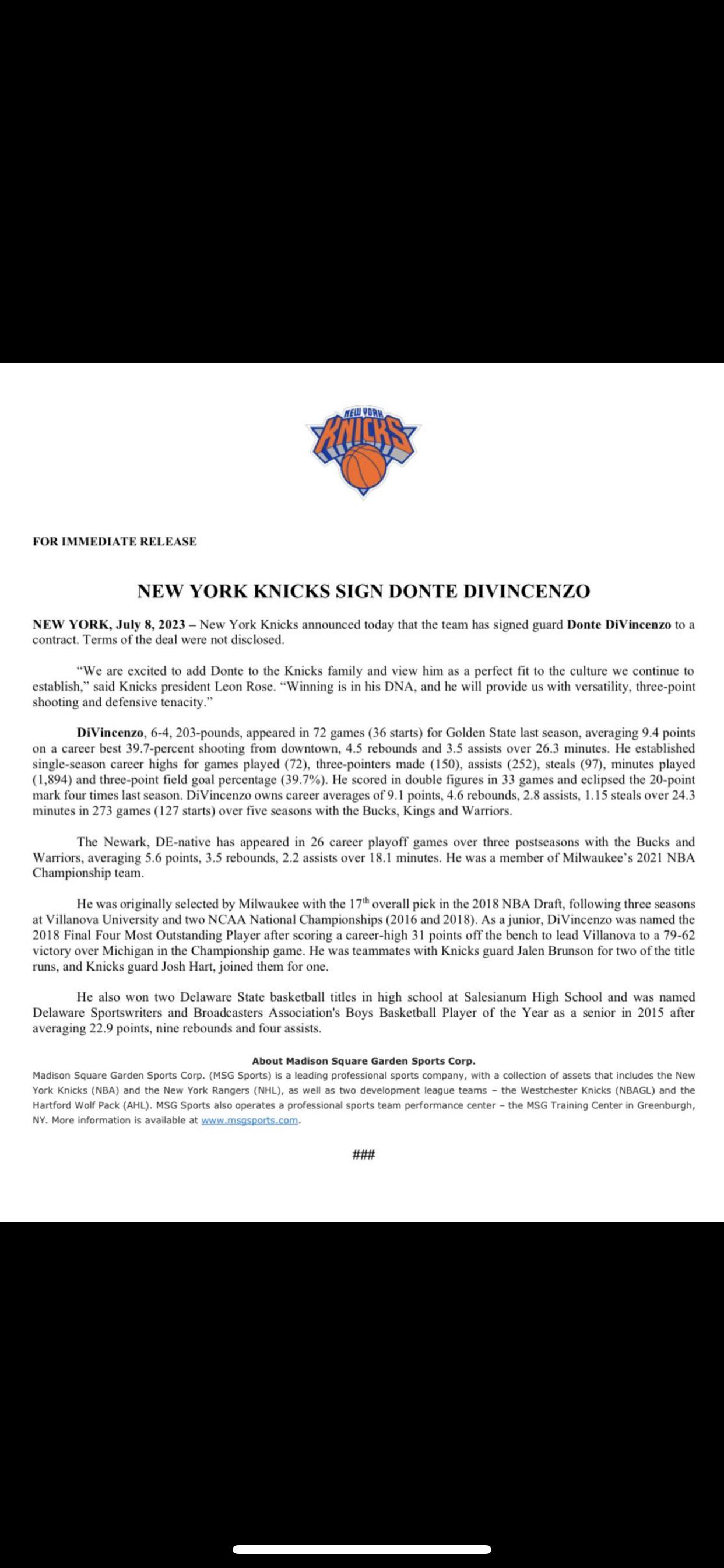 [Ian Begley] Knicks president Leon Rose says club views Donte DiVincenzo “as a perfect fit to the culture we continue to establish. Winning is in his DNA, and he will provide us with versatility, three-point shooting and defensive tenacity.” NYK makes DiVincenzo signing official: