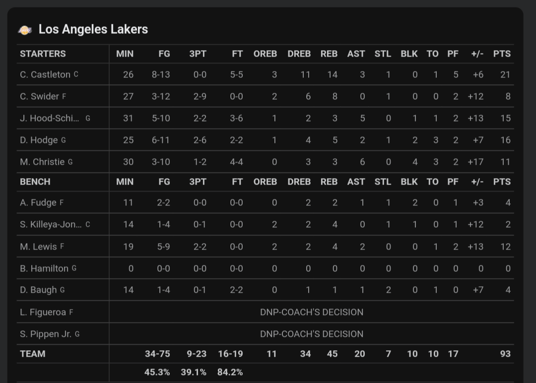 Lakers clearly went for athletic, bigger, and longer players this draft/FA. Fino is improving as each game goes by and and Max has shown some flashes as well. Christie is gonna be huge for us if he is able to translate his growth shown here in summer to the regular season and playoffs. Also, Castleton is legit. Think he will get a contract soon