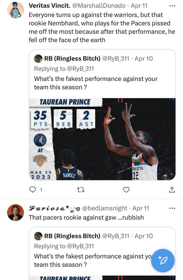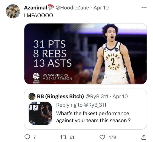 Reading comments of Warriors fans mad about the Nembhard game is one of my favorite pastimes. by Outrageous_Hamster_6 Central DivisionEastern ConferenceIndiana Pacers Prev Post Top 2 PGs of the generation… July 10, 2023 Next Post Patty Mills trade, Atlanta Hawks roster reset, and Summer League win over Denver Nuggets July 10, 2023 1 Comment MontaEllisBurner 3 years ago I believe the Pacers are the only team the Warriors haven’t beaten at the Chase Center yet. Every year, a random Pacers player seems to pop off too:* 2022-23: Andrew Nembhard (31 points, 8 rebounds, 13 assists)* 2021-22: Chris Duarte (27 points, 7 rebounds, assists)* 2020-21: Aaron Holiday (16 points and 12 assists off the bench)Write A CommentYou must be logged in to post a comment.
