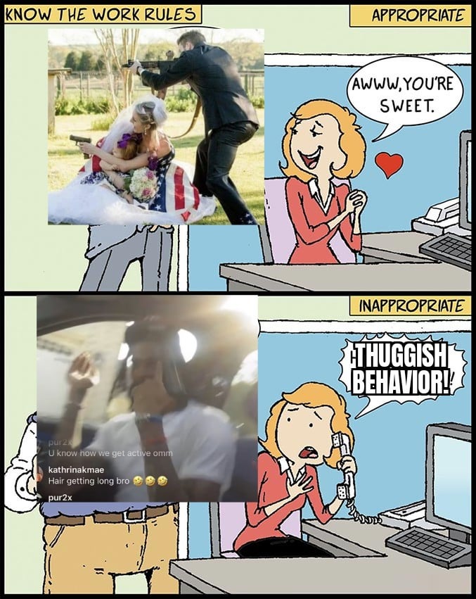My wife made a similar point. Would Austin Reeves have been suspended if he insta live streamed himself plinking beer cans with an AR15 while listening to Toby Keith?