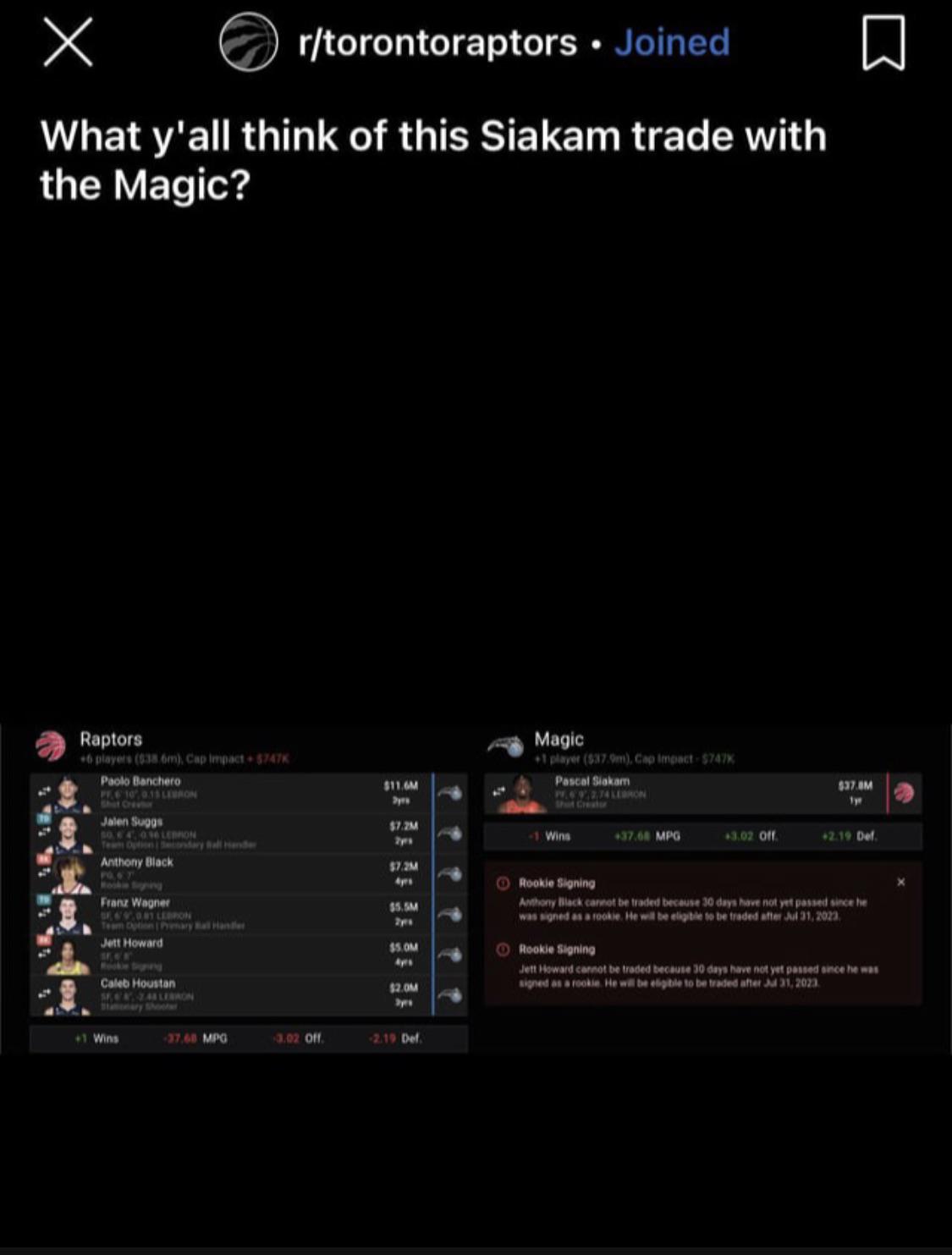 it’s probably satire but still funny af by Churchills_m8 Eastern ConferenceOrlando MagicSoutheast Division Prev Post Reminder: We’re a very early game tonight 5pm Central, 6pm EST, 10pm GMT July 11, 2023 Next Post Johnny Davis and Bilal Coulibaly Have Strong Start to NBA Summer League July 11, 2023 23 Comments megATron012 3 years ago Might as well include 5 1sts too and Stuff for Home games /s Drewbacca_Hrrrgrgrar 3 years ago Knowing how Raptor fans are, I wouldn’t be surprised if this was real lol radardog2 3 years ago Who says no? d12fsu 3 years ago I wouldn’t do this unless we included the keys to the city, Disney world, and Buddy Dyer NAMskalle98 3 years ago Add yoeyz and we have a deal quedas 3 years ago As crazy as Raptors fans can get, this is very clearly a joke, no matter what anyone there says. Edit: went to check – everyone there knows it’s a joke, including OP. Jos_Andrews 3 years ago Raptors getting fleeced. Paolo who? This is Pascal Country now!!! /s rockstarrugger48 3 years ago We do the same shit here. Sarkosuchus 3 years ago Yep, definitely a joke post. That is pretty much the entire roster of the Magic. LilPuuuma 3 years ago Throw bitch ass Ron DeSantis in there and we got a deal LemmingPractice 3 years ago I mean, it’s pretty clearly a joke post. ComedianManefesto 3 years ago They overrated their guys really bad, but so does their GM. tobydiah 3 years ago I once saw a Lakers fan shit his pants. That doesn’t mean Lakers fans tend to shit their pants. palehorse69 3 years ago Children 😒 ratonbox 3 years ago I would get shitfaced as well if I had to live in Toronto despereanx 3 years ago It only gives the Raptors 1 extra win? Seriously? Pascal isn’t even worth a Paolo let alone our entire young core. Big_A_All_Day 3 years ago Wtf? 😂 jackloganoliver 3 years ago Literally zero up votes on the post. It’s obviously a troll/drunk post. 0rlando_95 3 years ago I’ll do it if you throw in prime Lebron Soccerisntwrong 3 years ago +1 win tho retrobat 3 years ago I’ll do it if they take Desantis too. 1DapperRaptor 3 years ago Clearly a joke…raptors fans are I’m shambles knowing we have no hope ahead and no pick to help badjeje77 3 years ago if this happens, your front office is really dumb. Write A CommentYou must be logged in to post a comment.