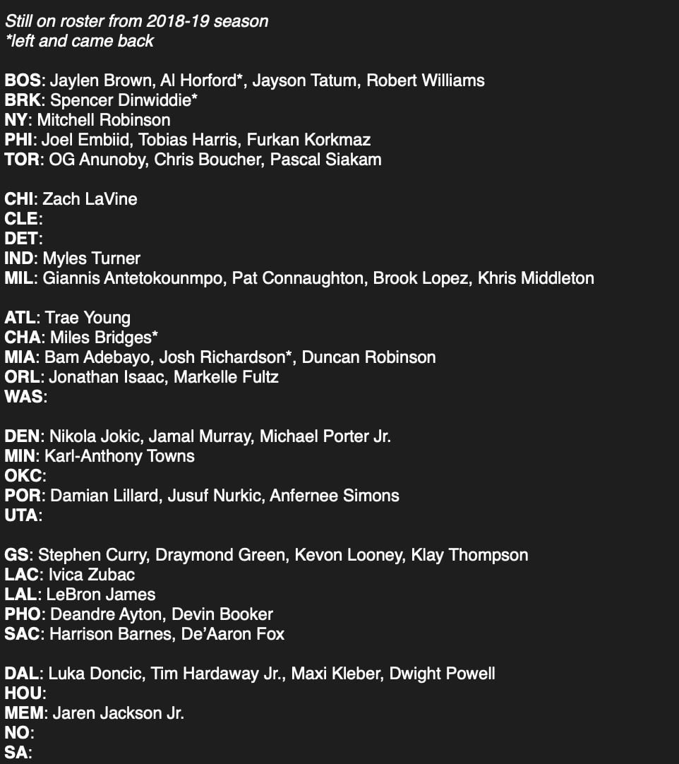 [Murray] How much does the NBA change over in 5 years? None of the 30 NBA teams have more than 4 players left from the 2018-19 rosters …. 8 teams have no players left from the 2018-19 season