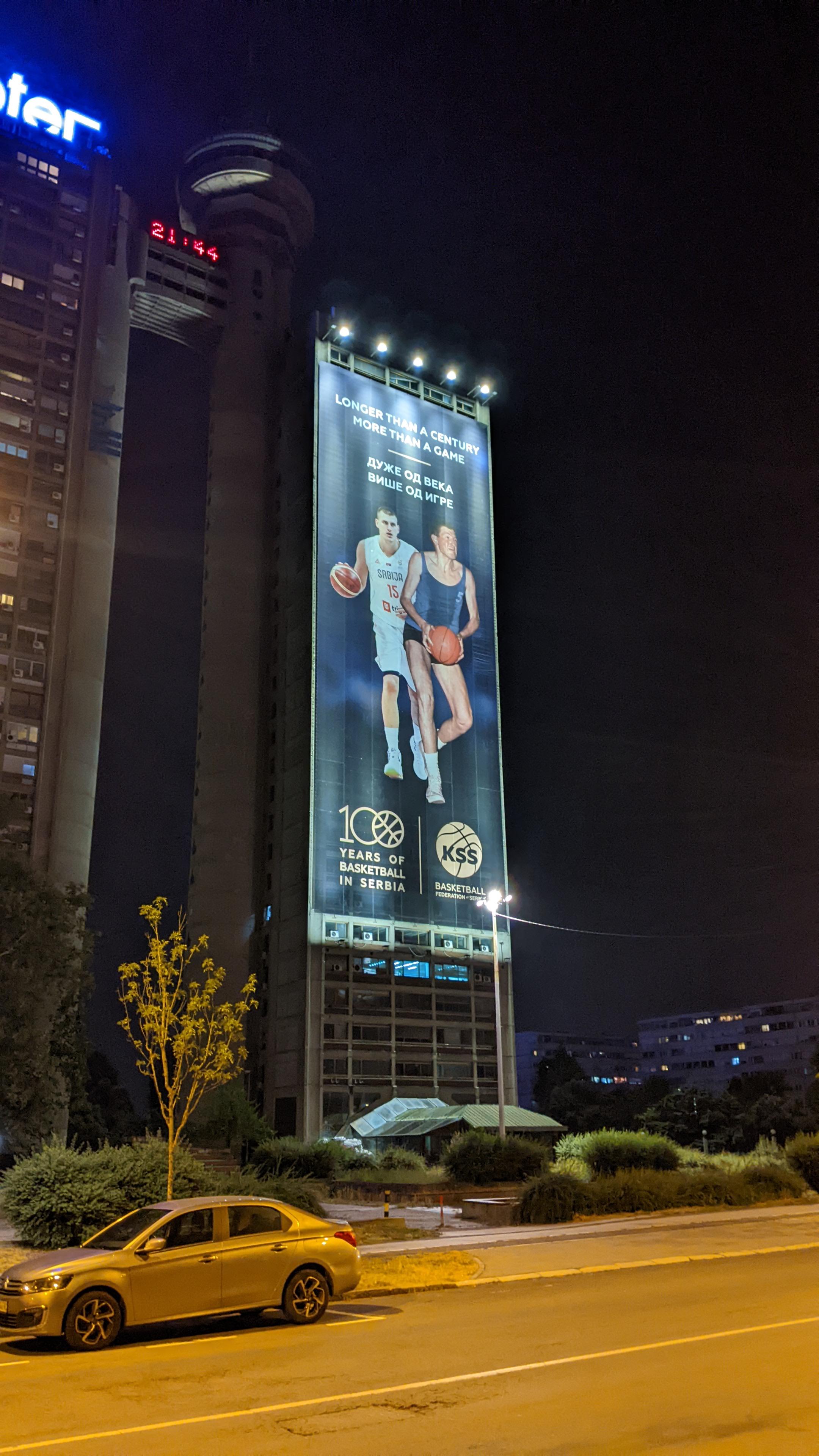 Billboard of our championship tub of lard on one of the tallest buildings in Belgrade