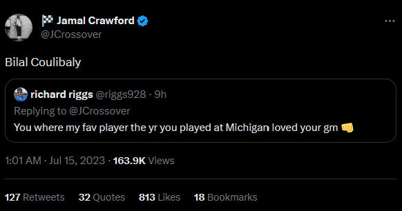 Jamal Crawford: Bilal Coulibaly by gorborian Eastern ConferenceSoutheast DivisionWashington Wizards Prev Post Pacers Summer League Grades: Sheppard catches fire, Walker struggles in ugly loss July 15, 2023 Next Post NAG-IINIT NA PERO MAS MAG-IINIT PA KAYA?KONTRA BOSTON CELTICS|BUMALIK NA ANG KUMPIYANSA AT TIWALA| July 15, 2023 10 Comments ComradeHines 3 years ago What the hell does this even mean LMAO Turbo2x 3 years ago Bilal Coulibaly ColdNyQuiiL 3 years ago Haven’t been this confused since Roger Mason. “Looking like a season. How u” BayTerp 3 years ago Bilal Coulibaly RubberFistOfJustice 3 years ago He was responding to fans and I think he just messed up lol bombation 3 years ago Bilal Coulibaly. Ourano 3 years ago Bilal Coulibaly Th3-3rr0r 3 years ago We going like the Kings Keegan Murray in here? Bilal Coulibaly kornthrowaway 3 years ago Bilal Coulibaly New_Essay_4869 3 years ago Indeed. Bilal Coulibaly is always the answer Write A CommentYou must be logged in to post a comment.