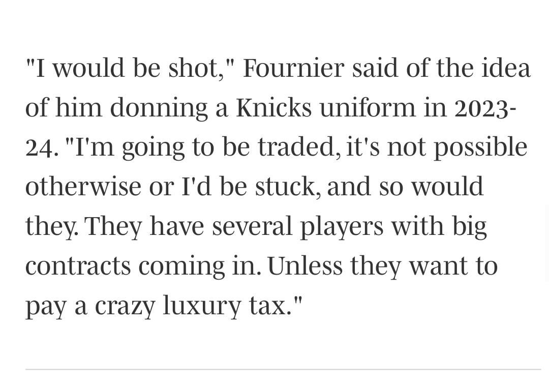 His trade value is just that of an expiring contract he can’t really tank it any further. No team was really trading for Fournier to get him as a player. I am glad Fournier was a pro last season and waited until the season was over to make these statements. He will get traded, it is just a matter of finding the right contract to take back. Ideally, I would like to see the Knicks take back a decent but overpaid stretch 4 with 2 years left at a similar salary and get back a protected first for it. Not sure who fits that bill but there are a lot of bad 2 year deals teams will be looking to get out of to avoid the tax or avoid the second apron.