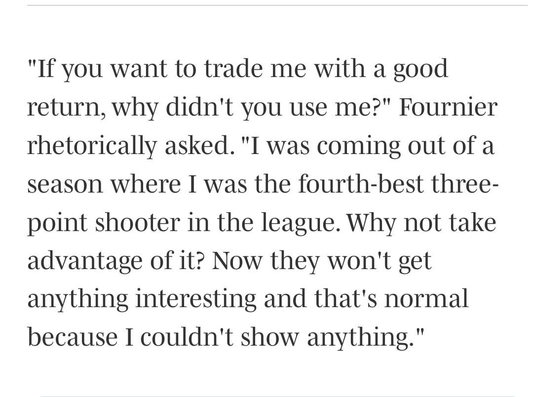Idk the Fournier hate hear. Dude is a professional basketball player saying that he wants to play basketball and since his current team clearly has zero intention of having him play basketball, he would like to be traded to a team that will allow him to play basketball.