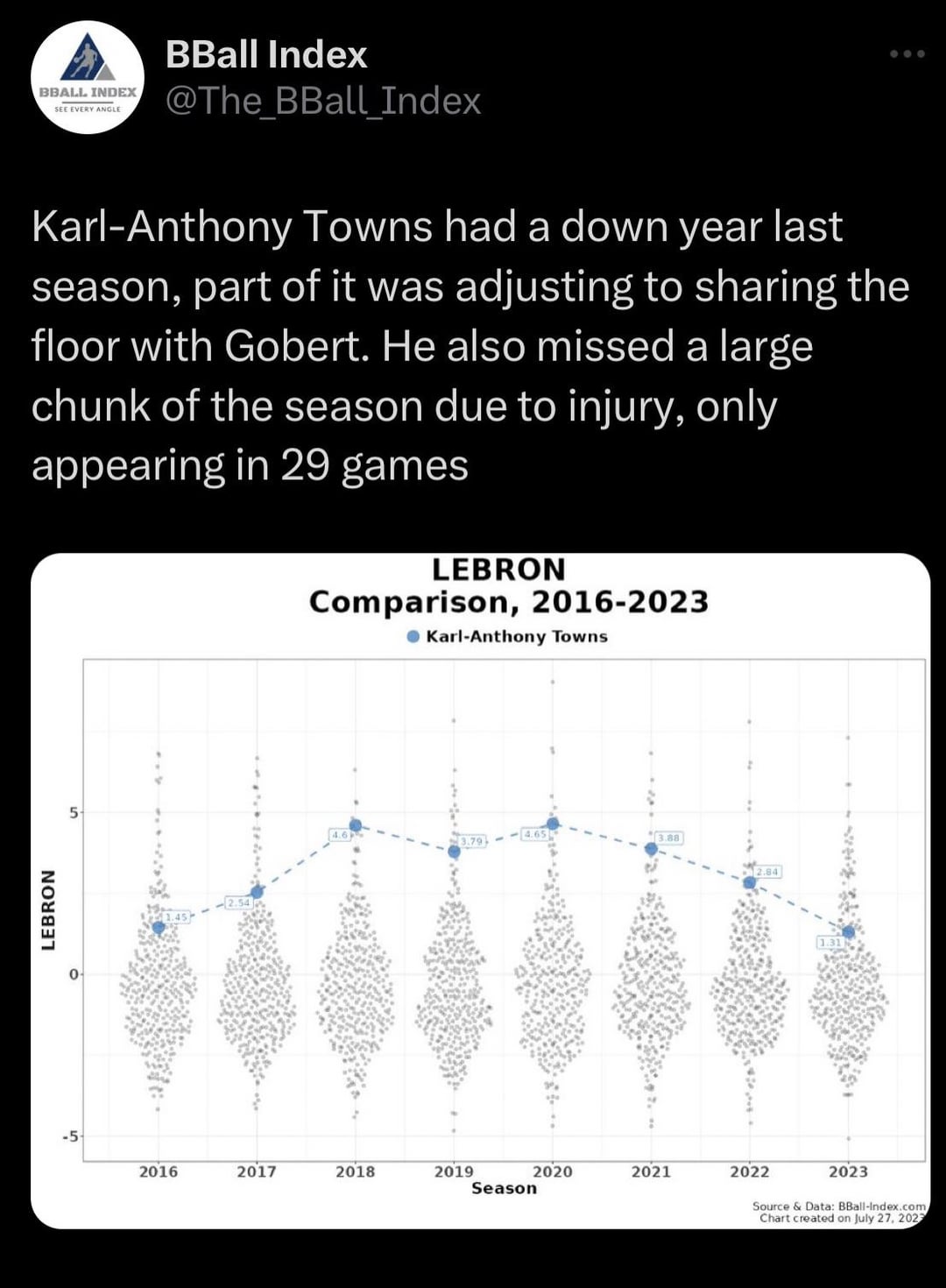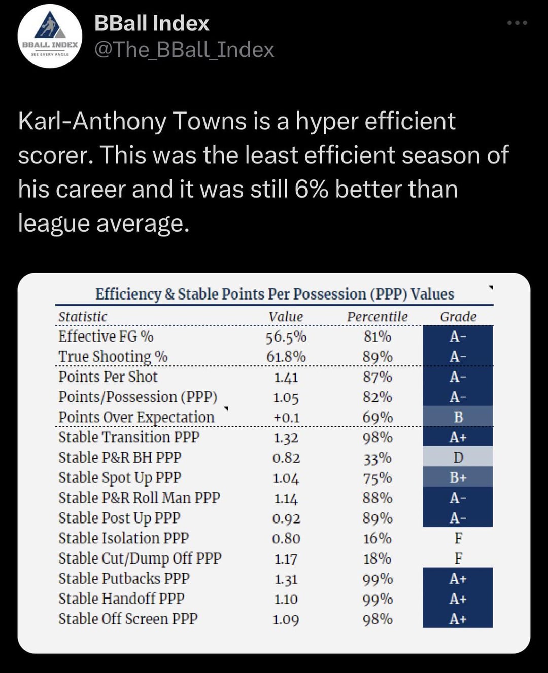 This is not a bash KAT comment at all, but thought this perfectly captures who he is. An elite shooter, good rebounder, with some bizarre flaws.