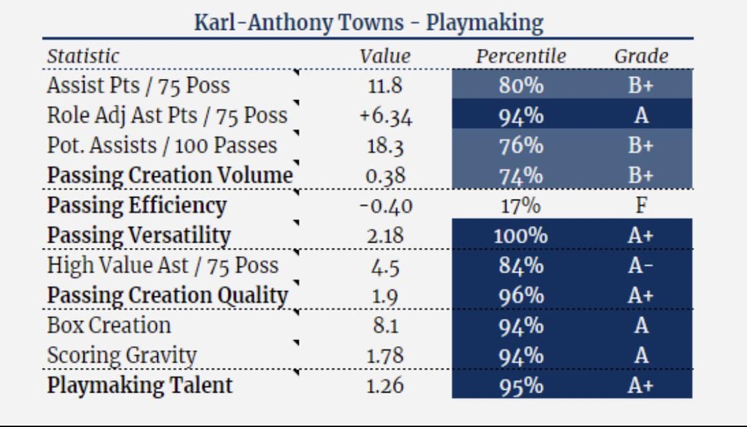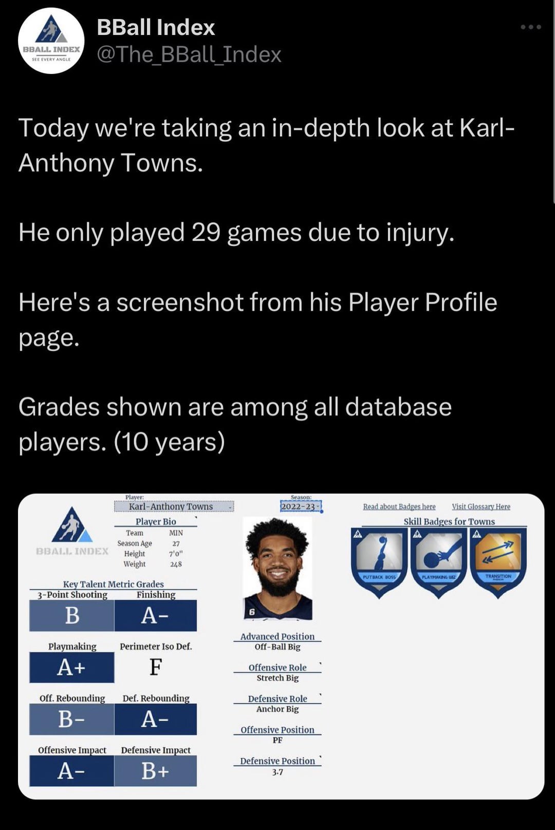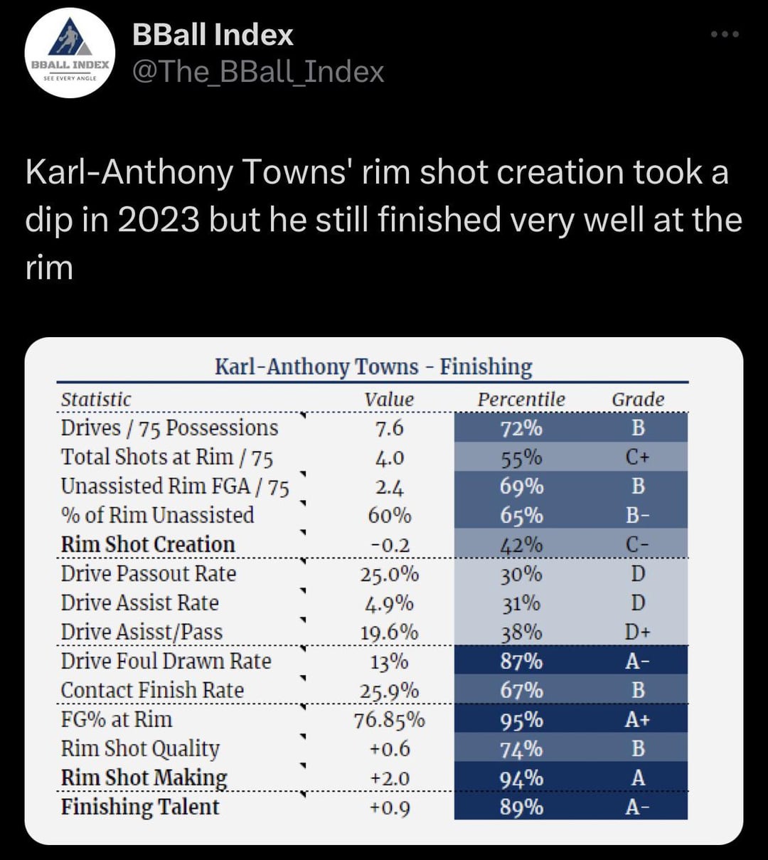 Same scenario with his Finishing grade being an A- but his Iso grade being an F. KAT’s limiting factor always seems to be his mental game and trying to do too much.