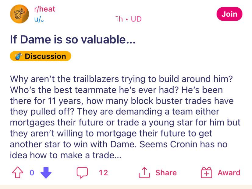 this is the most I feel ashamed of our fanbase. the cringiest one is probably those on twitter whose pfp is a Dame shopped in a Heat uniform. Honestly don’t think we’re getting Dame. I seem him staying with you guys and probably get dealt at the deadline to another contender in the east. Nothing will change from our asset from now until the regular season and I know the bridge has been burn between the Heat and Portland. Our fellow heat fans are just in denial stage at this point. I ain’t one of them.