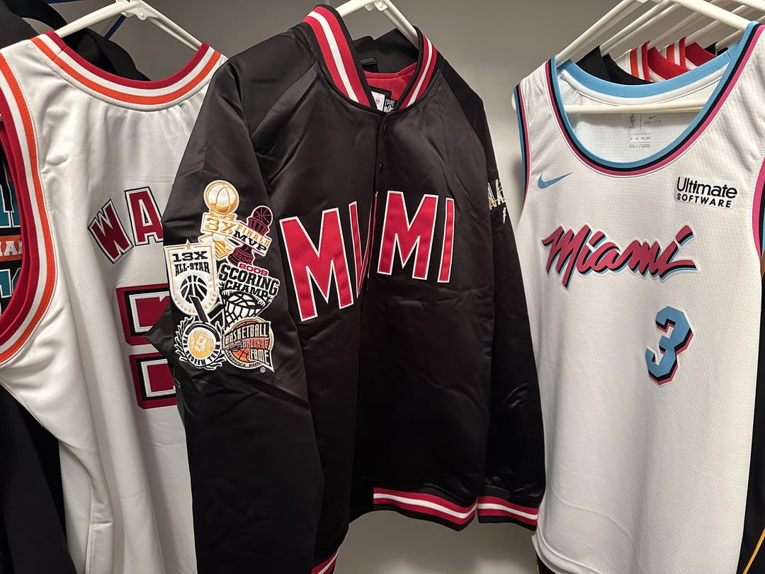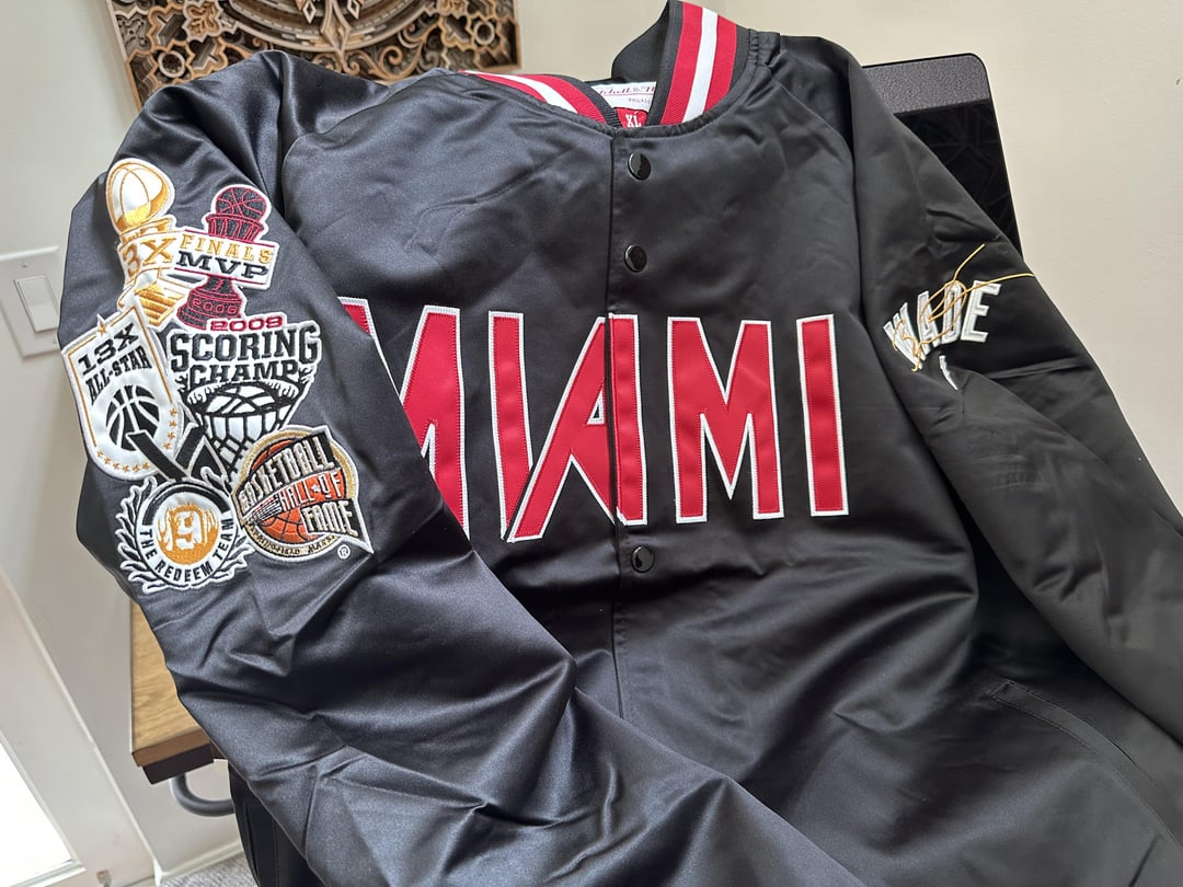 I’m actually really happy with this this jacket. Everything is stitched/embroidered, material seems durable, and it’s not very shiny like most satin jacket you see. Nice soft interior lining. Its medium weight. I love the mashup of Dwade’s accomplishments on the sleeve.