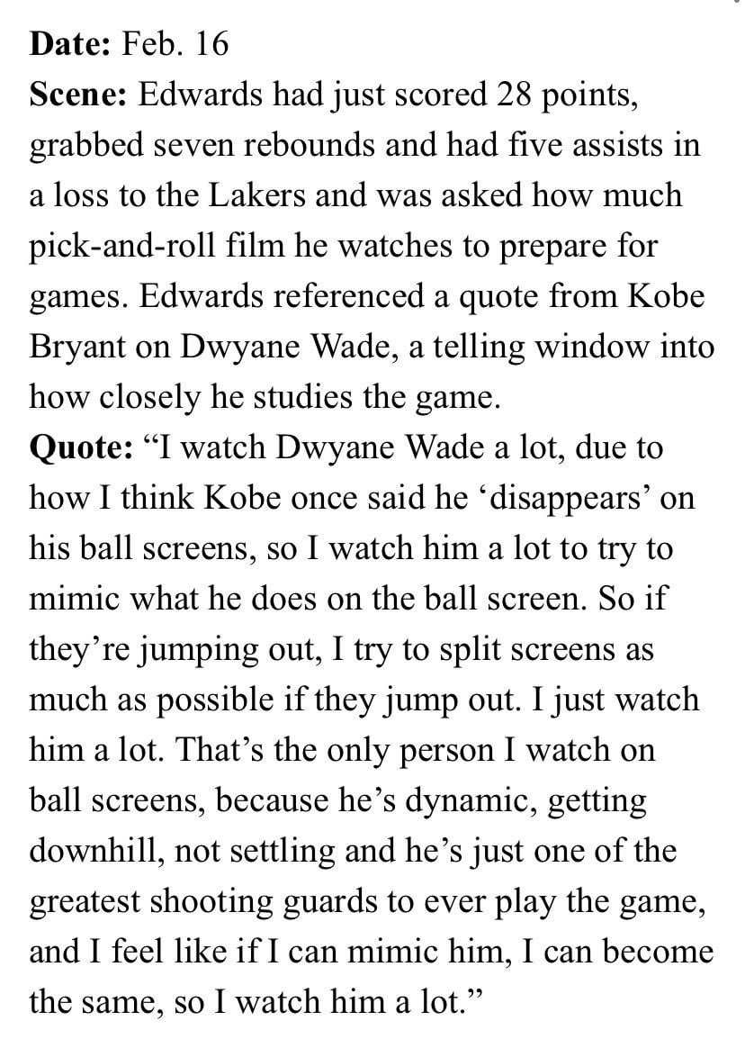 "I watch @DwyaneWade a lot, due to how Kobe once said he ‘disappears' on his ball screens. That's the only person I watch on ball screens, b/c he's dynamic, getting downhill…he's one of the greatest SGs ever. I feel like if I can mimic him, I can become the same” @theantedwards_ https://t.co/h5iQtP0aKV pic.twitter.com/vJo9NEzZjH