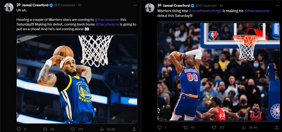 [Jamal Crawford] “Uh oh. Hearing a couple of Warriors stars are coming to @thecrawsover this Saturday!!! Making his debut, coming back home @Garydwayne is going to put on a show! And heโs not coming alone ๐” “Warriors rising star @JonathanKuming6 is making his @thecrawsover debut this Saturday!!!”