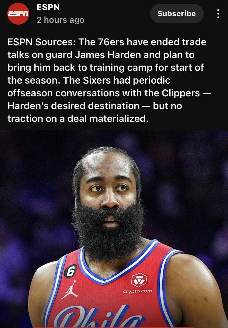 The 76ers have ended trade talks on James Harden and plan to bring him back to training camp for start of this season.