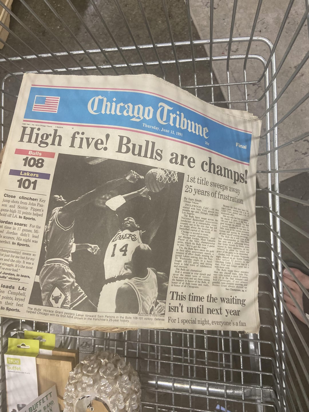 I picked this Chicago Tribune copy today at an antique mall in Charlotte. When I checked out eBay to look at pricing for something like this, this version of the paper was non existent and it was only copied with Jordan holding the trophy.