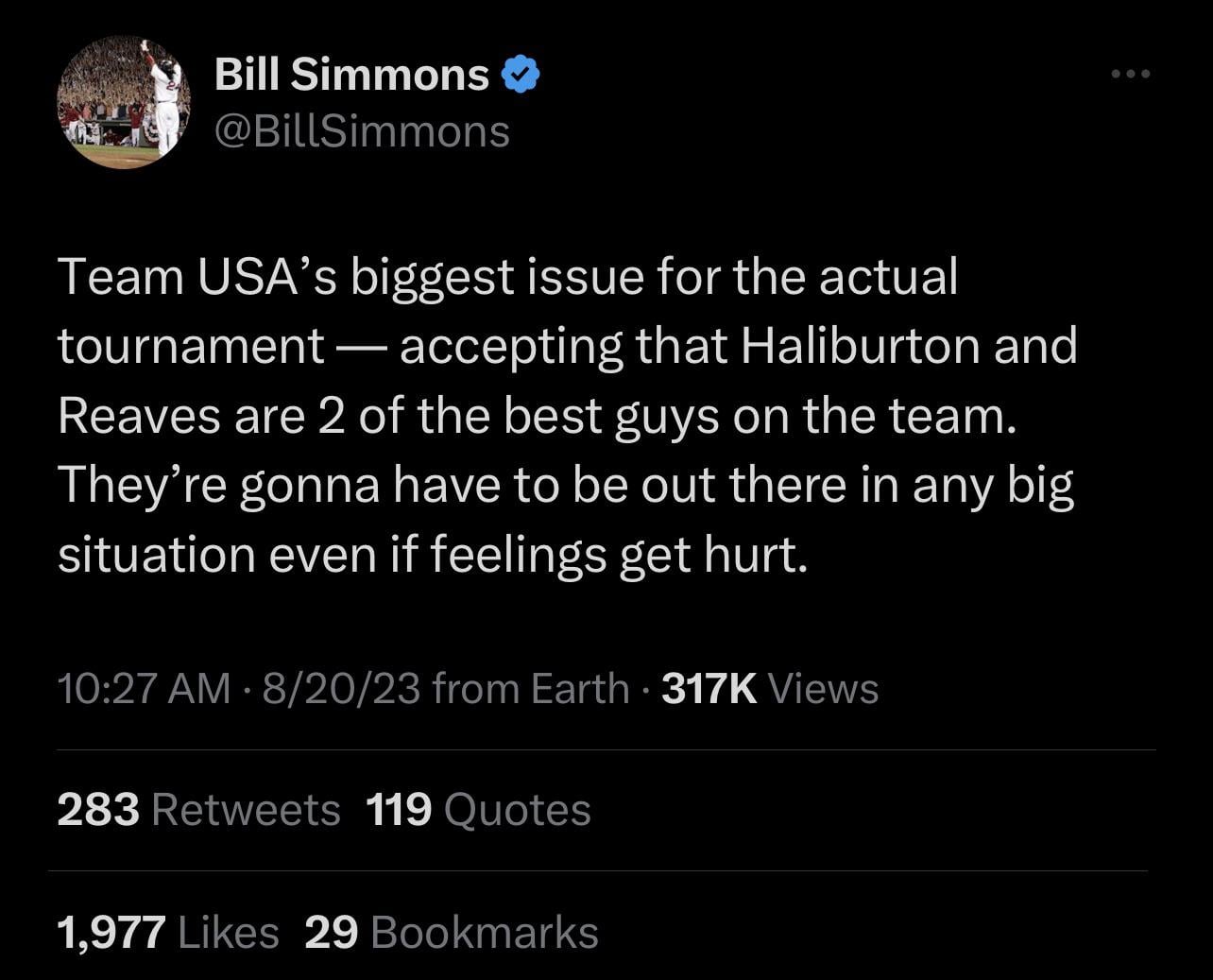 I feel like Kerr knows what’s up from past mistakes of the USA team. He built a team of players he has specific roles for. He didn’t give a shit if he had all the flashy names from the NBA All Star game. And so far the team seems to be playing well.